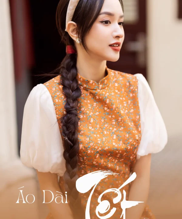 Ao Dai Elegant Orange Midi Dress in High Quality Silk – Floral Dress Blouson Vintage Style