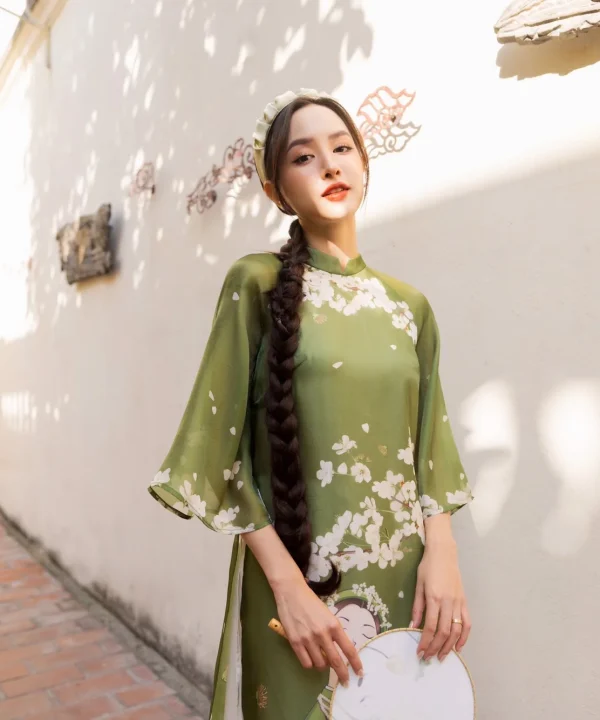 Ao Dai Elegant Green Midi Dress in Shiny Silk – Floral Dress Blouson