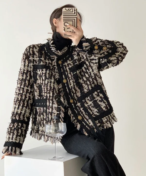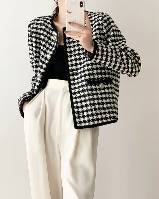 Women Houndstooth Tweed Boucle Blazer Jacket