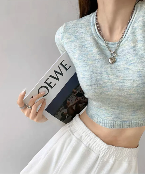 Elegant Round Neck Short Sleeves Crop Top (Blue)