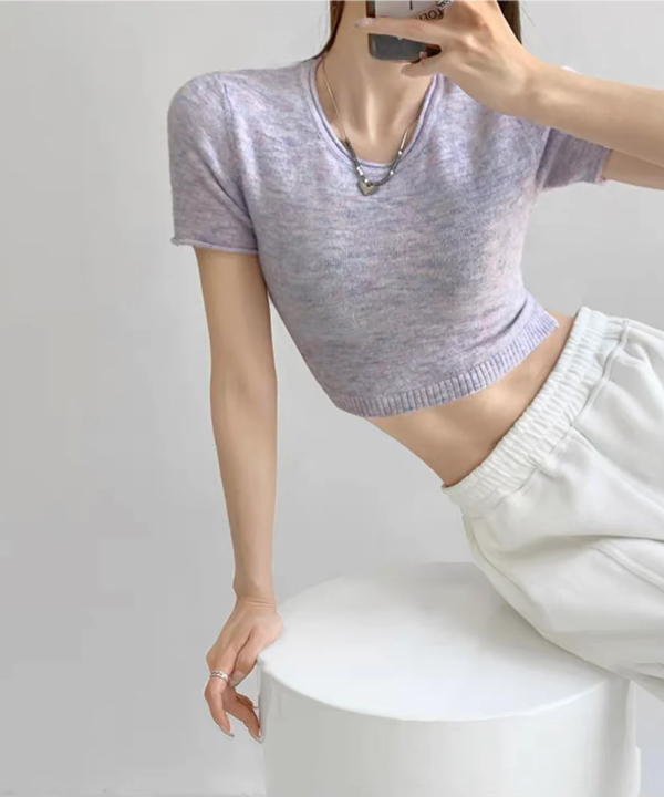 Elegant Round Neck Short Sleeves Crop Top (Purple)