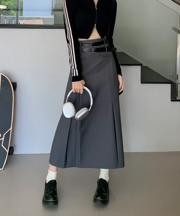 Grey Women Midi Skirt by Daisy Clothing with Double Belts