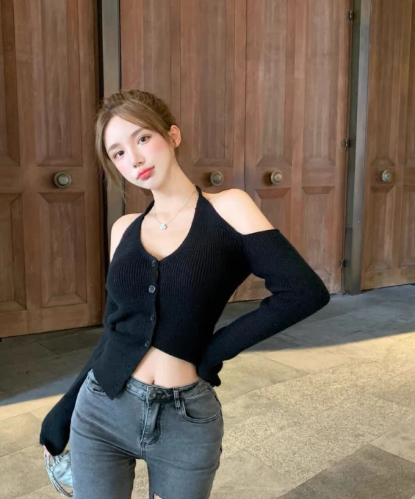 Chic V-neck Slim Long Sleeve Cardigan (Black)