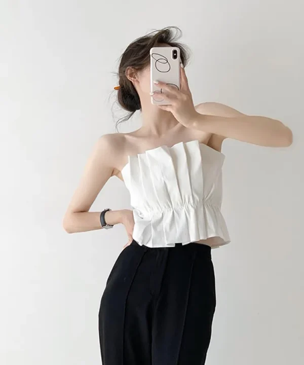 Women Sleeveless Tube Top – Strapless Pleated Cotton Tube Tops (White)