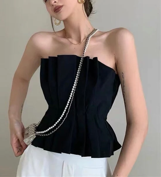 Women Sleeveless Tube Top – Strapless Pleated Cotton Tube Tops (Black)