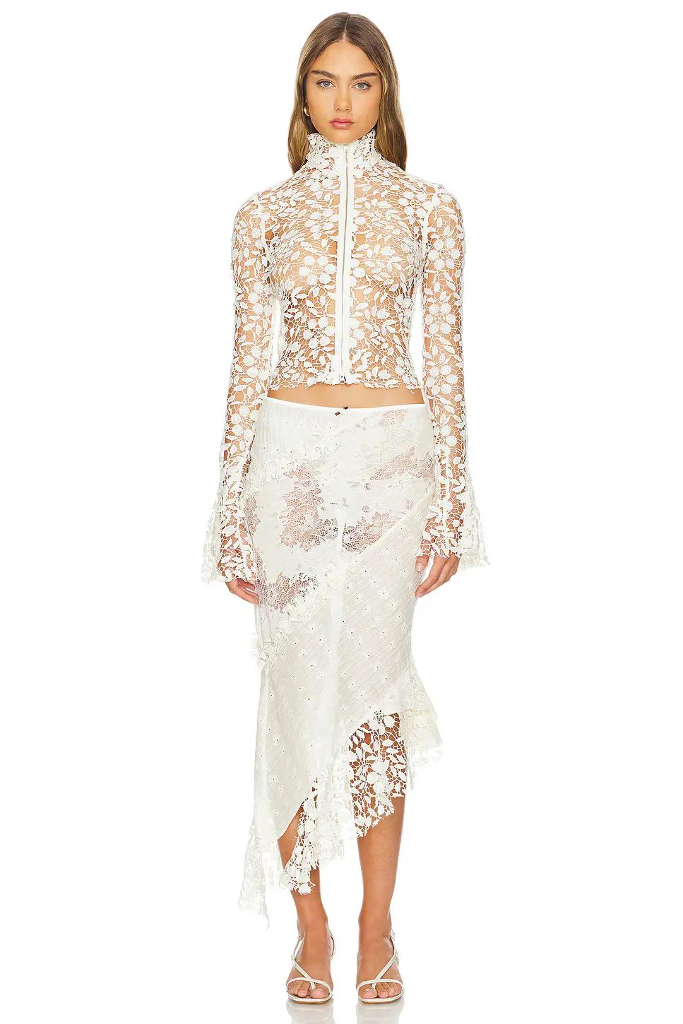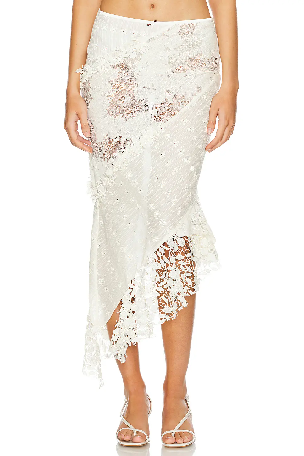 The Ayer Skirt from SIEDRES combines elegance and intricate design with its eyelet fabric and floral lace details. Perfect for a sophisticated yet feminine look, this asymmetric skirt is crafted with high-quality materials and features a flattering fit.
