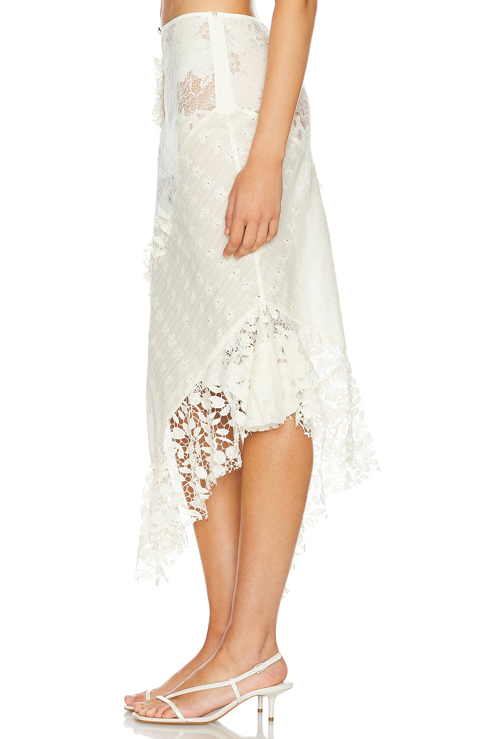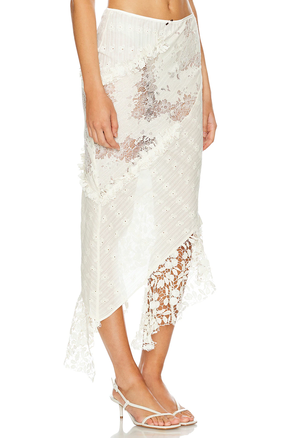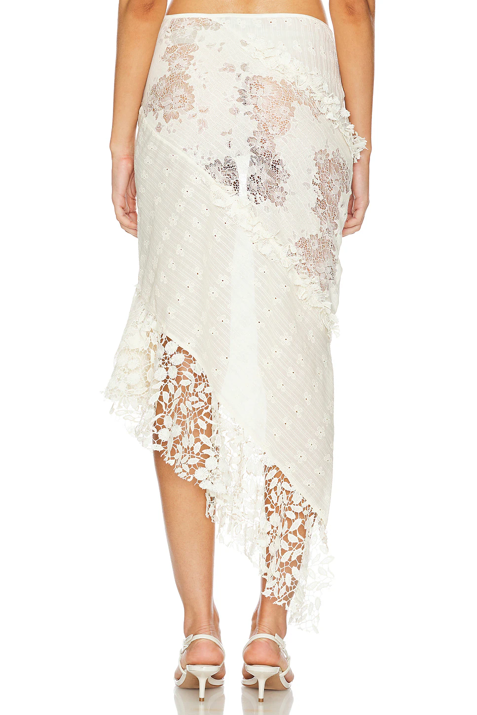 - Eyelet Fabric: The skirt features intricate eyelet detailing, complemented by floral lace panels and trim for a delicate, textured look.