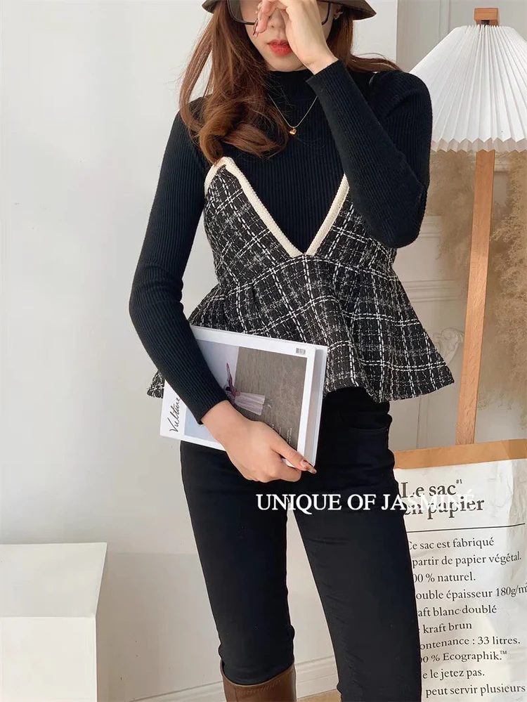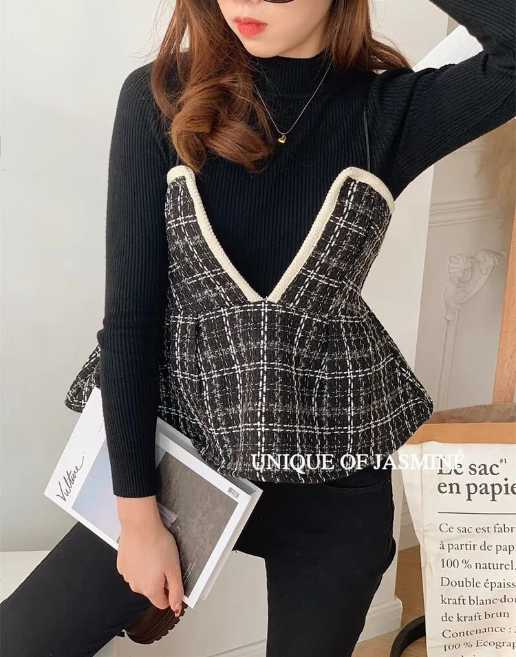 Elegant Checked Tweed Sleeveless Camisole Top (Black)