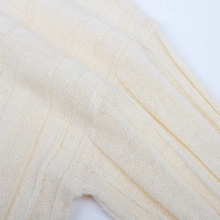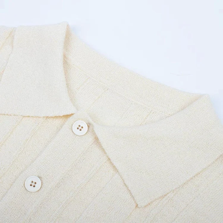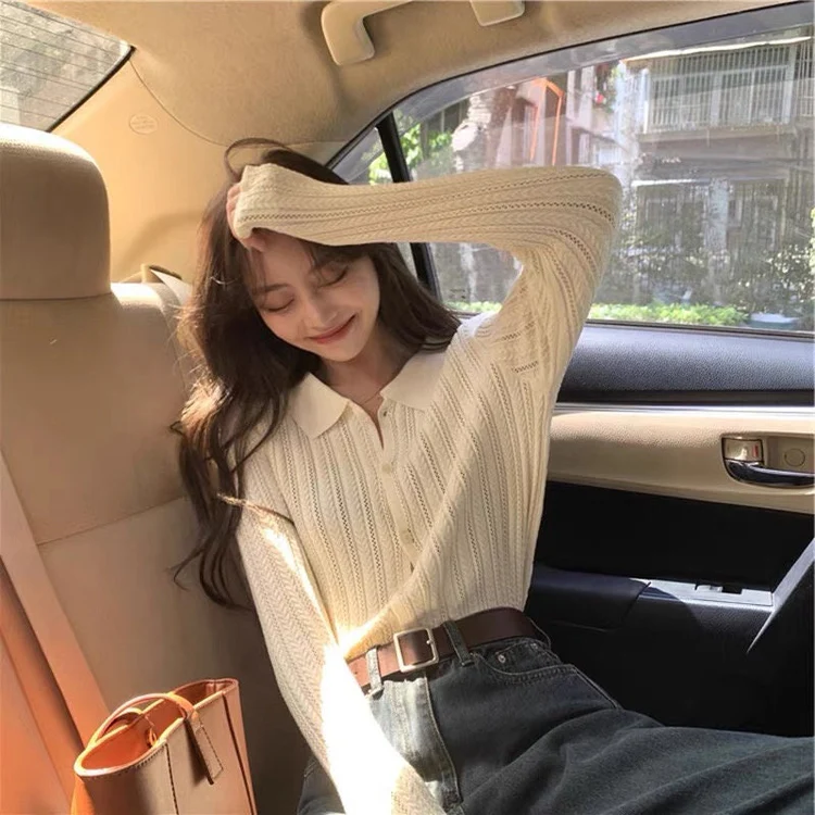 Elegant Long Sleeves Knit White Loose Polo Shirt Top