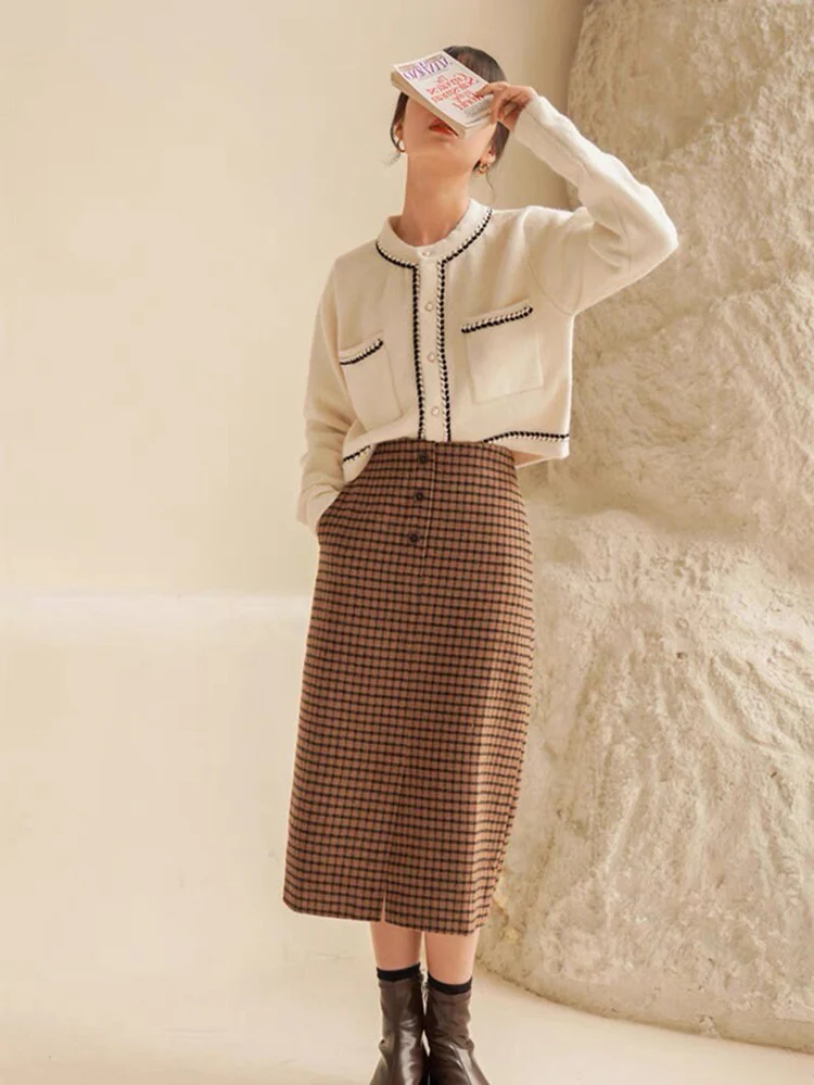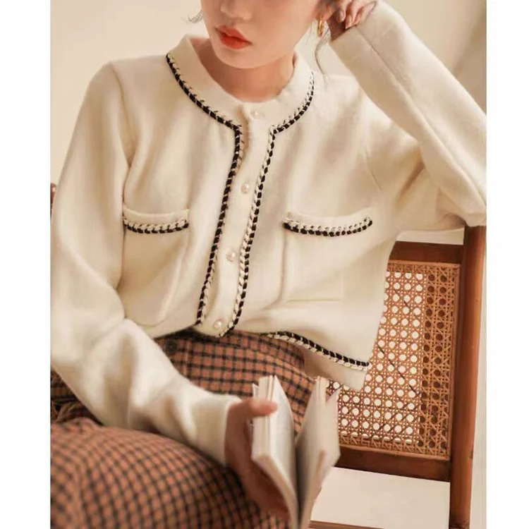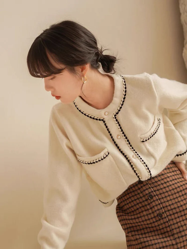 Elegant Round Neck Long Sleeves Cardigan (White)