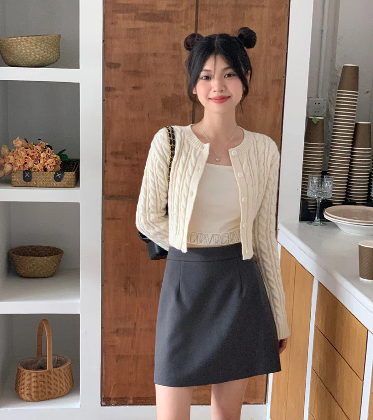 Elegant Round Neck Long Sleeves Cropped Cardigan (Cream)