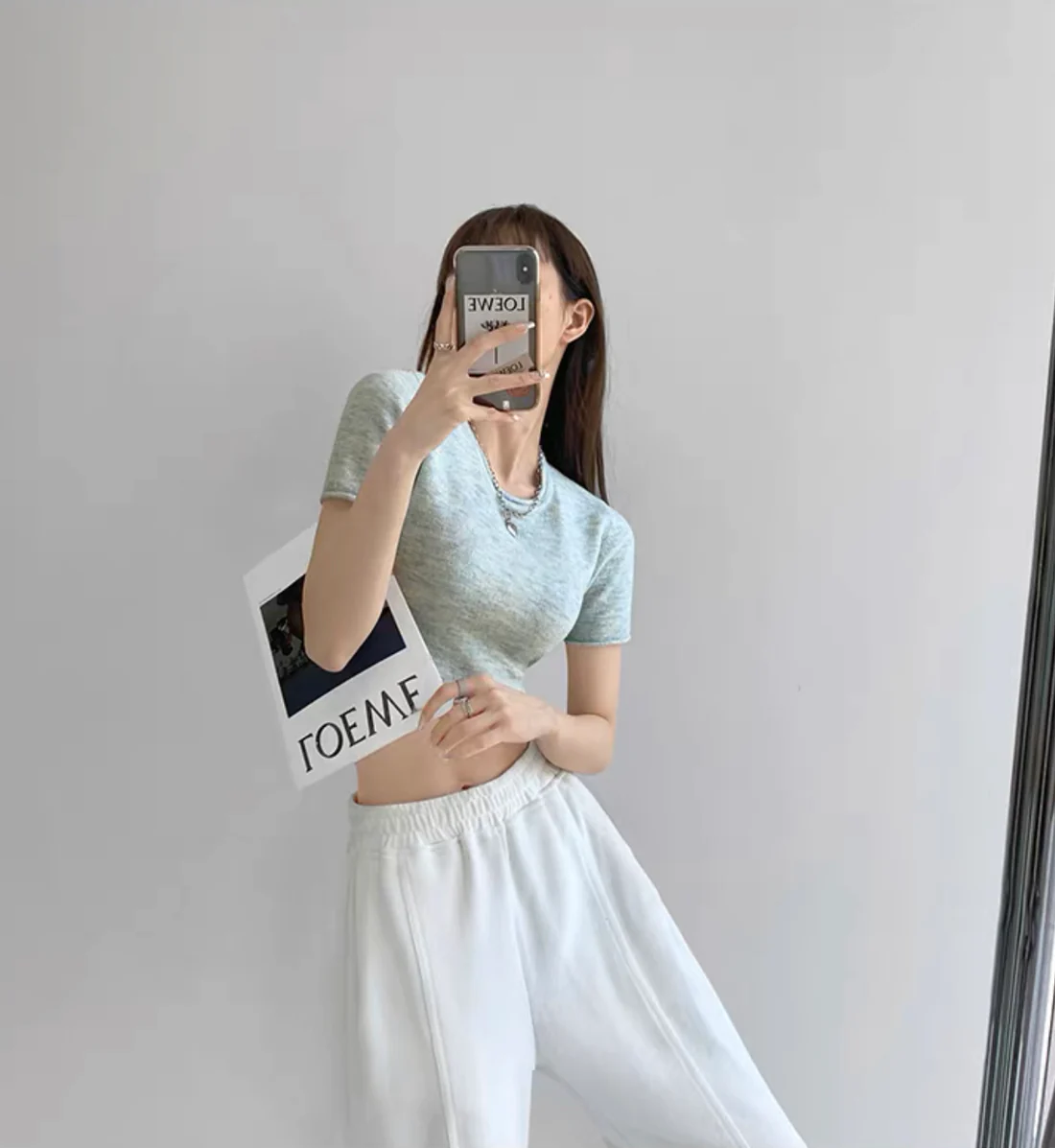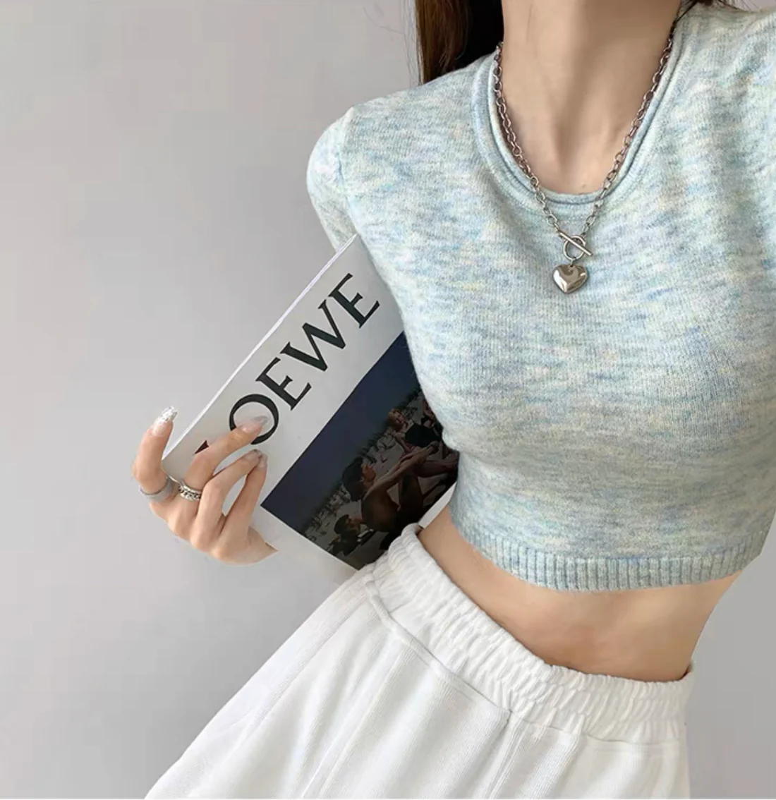Elegant Round Neck Short Sleeves Crop Top (Blue)