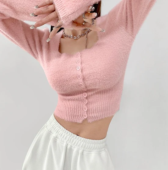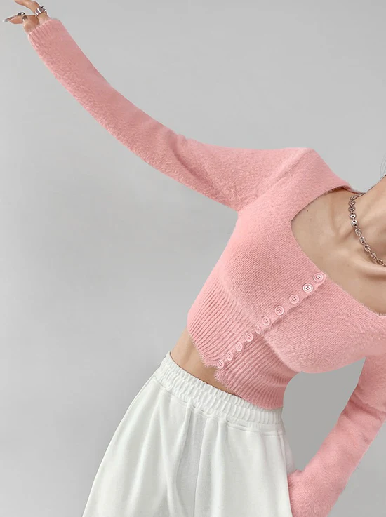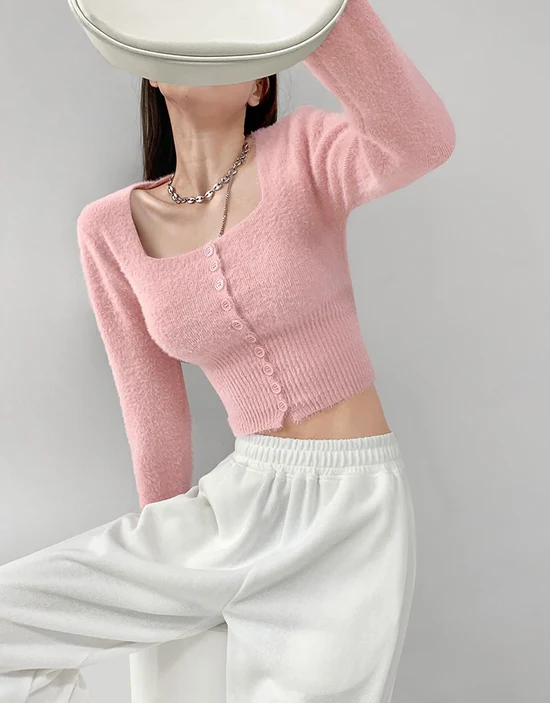 Elegant Square Neck Long Sleeves Crop Top (Pink)
