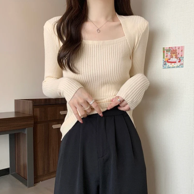 Elegant Square Neck Long Sleeves Top (Beige)