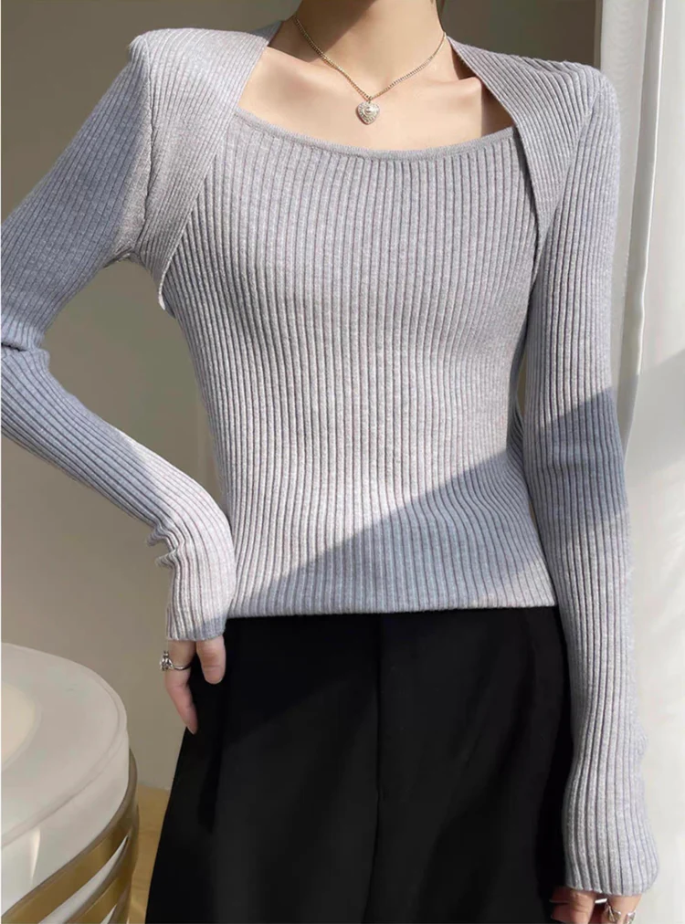 Elegant Square Neck Long Sleeves Top (Light Grey)