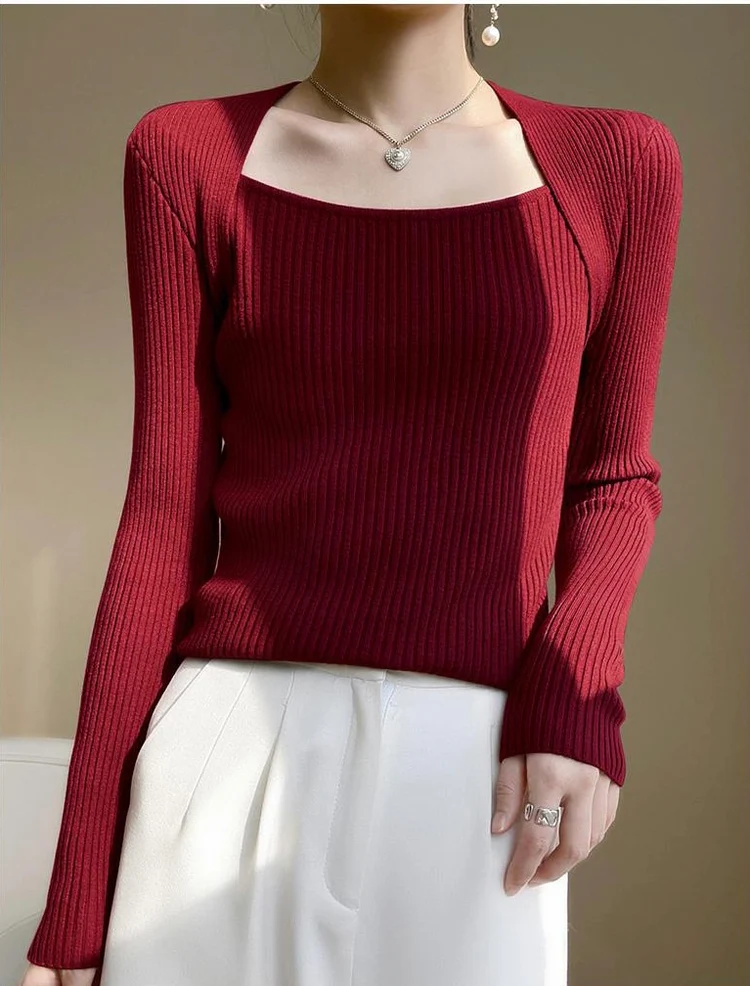 Elegant Square Neck Long Sleeves Top (Red)