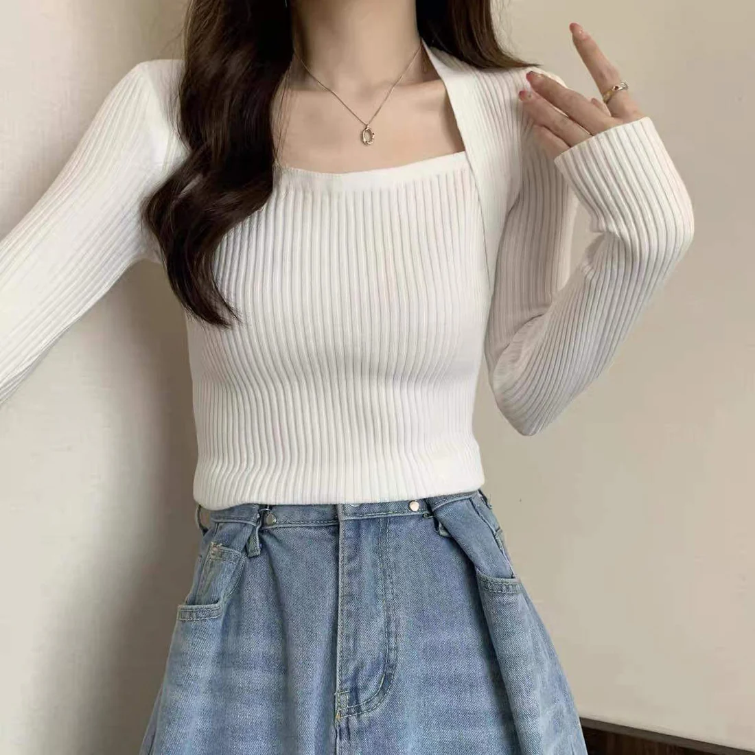 Elegant Square Neck Long Sleeves Top (White)