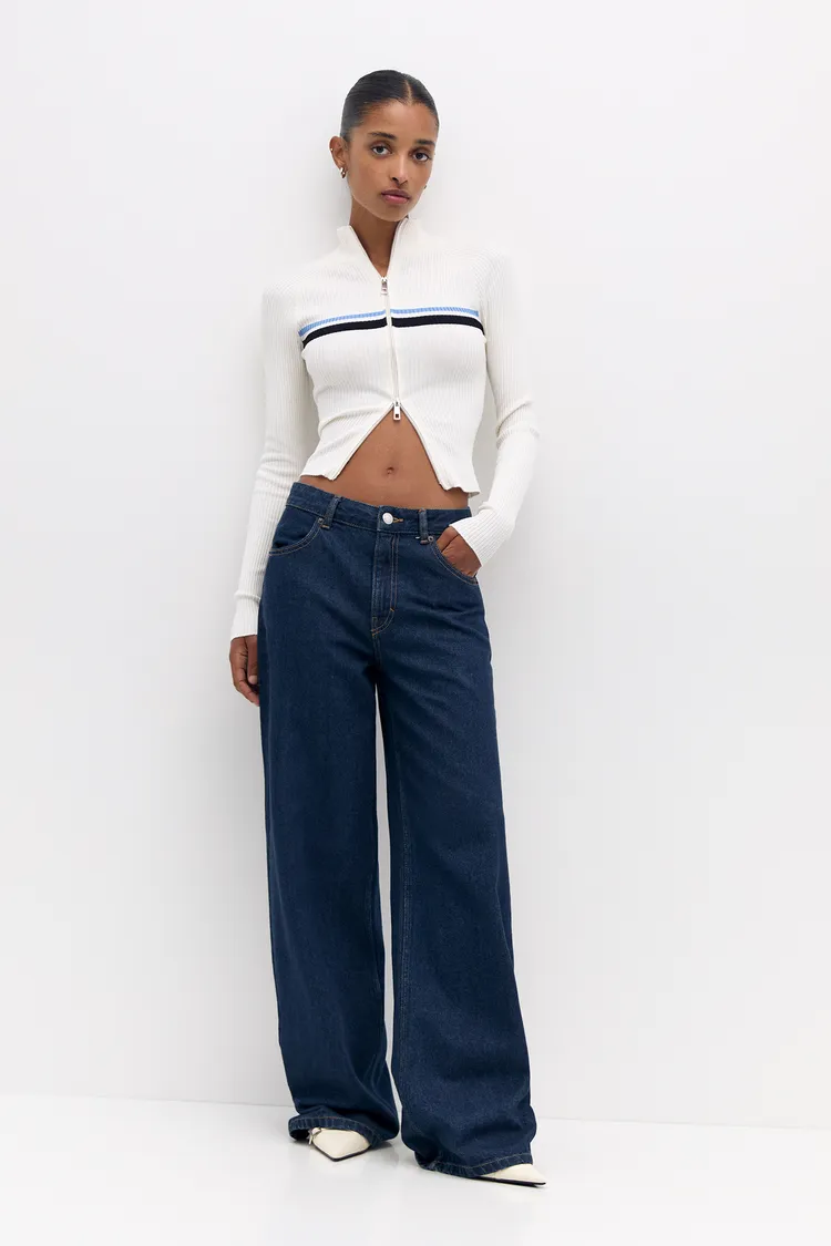 Elevate your wardrobe with the Ribbed Zip Through Jumper with Stripe Detail in Ecru by Pull & Bear. This stylish ribbed knit cardigan features a high neck and striking stripe detail, providing a contemporary touch to a classic design. Crafted from stretch fabric, it ensures both comfort and a flattering fit.
