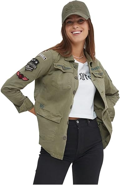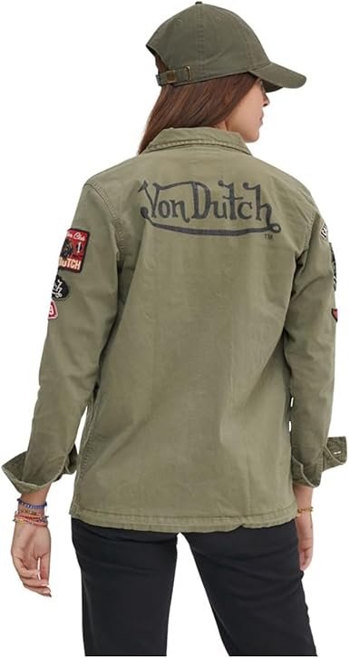 The Von Dutch Women’s Cotton Jacket in Angel Khaki is a timeless piece that combines vintage-inspired military style with unique embroidered patches. Crafted from 95% cotton, it embodies the spirit of freedom and creativity that Von Dutch is known for, influenced by pinstriping and hot rod culture.