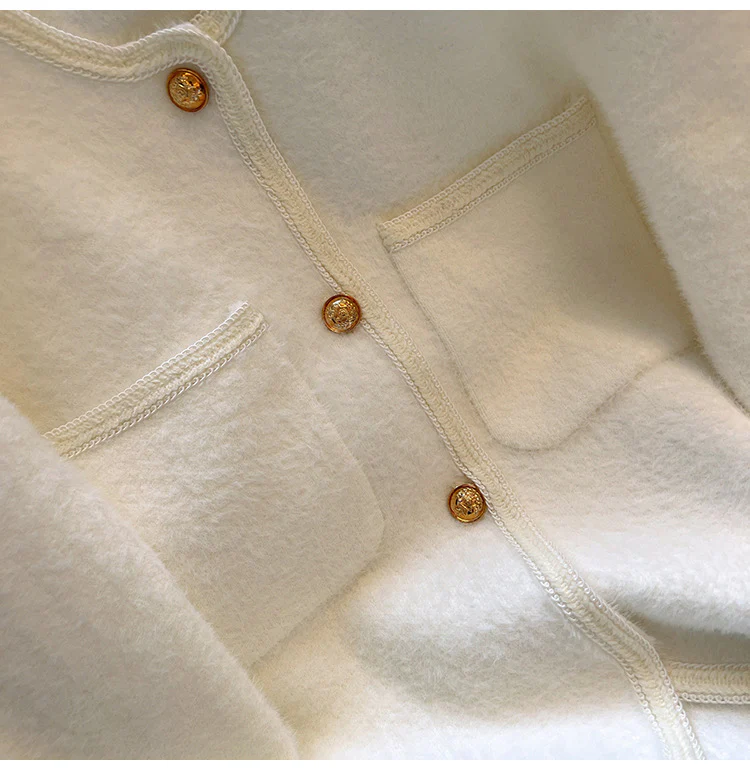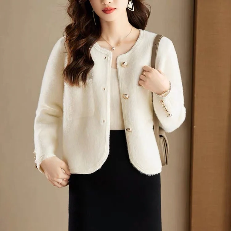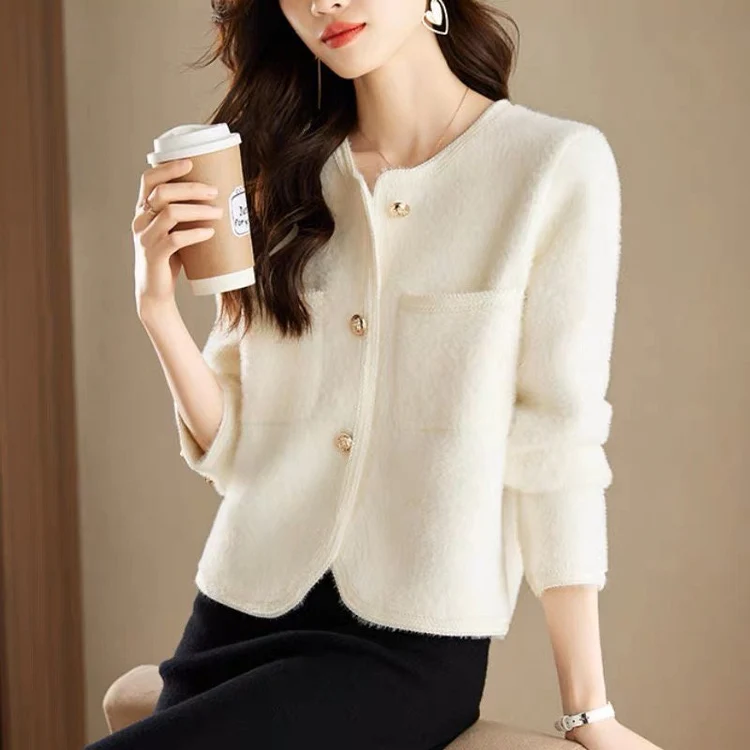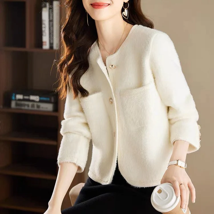 Women Elegant Scoop Neck Long Sleeves Cardigan (Beige)