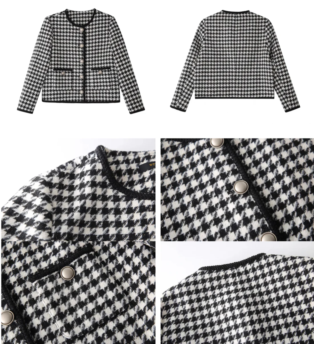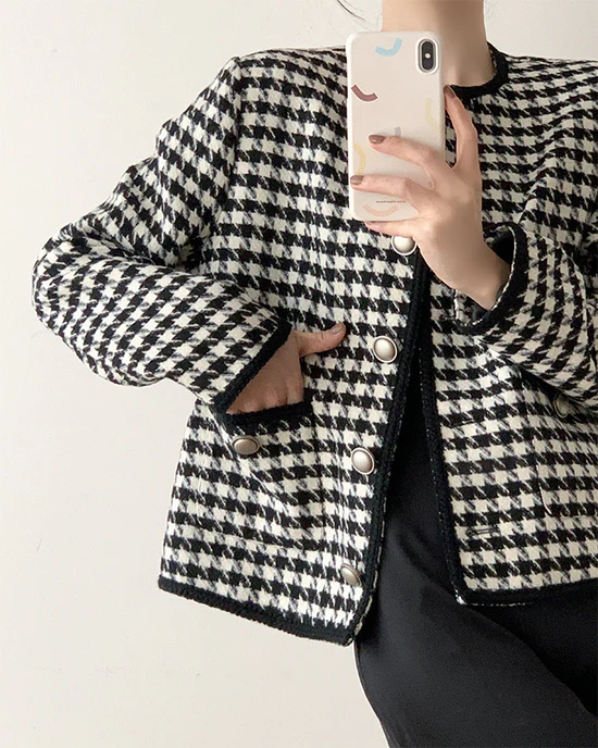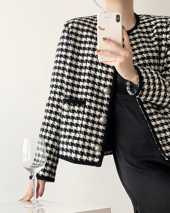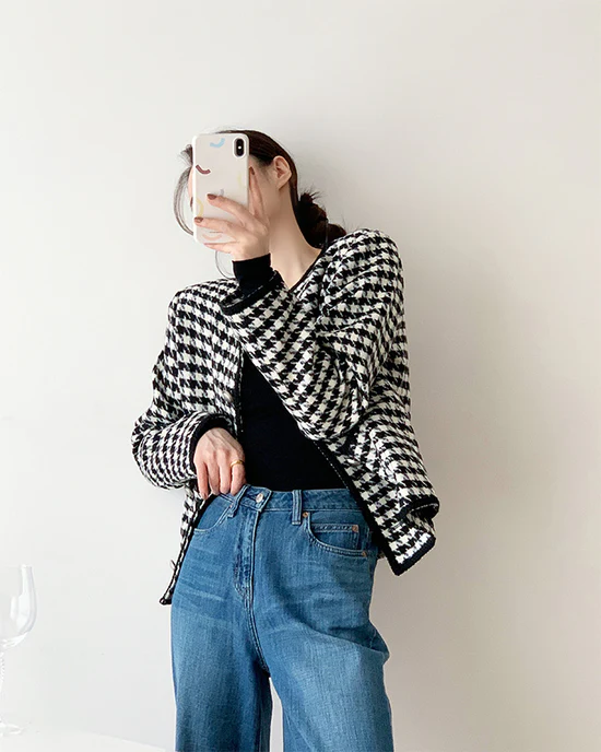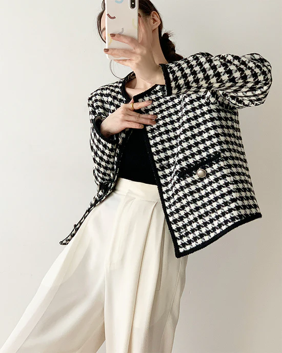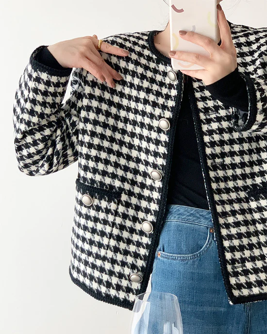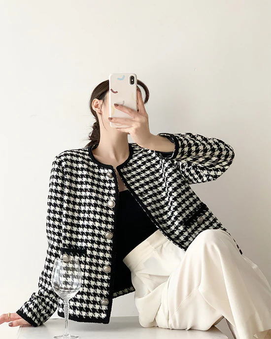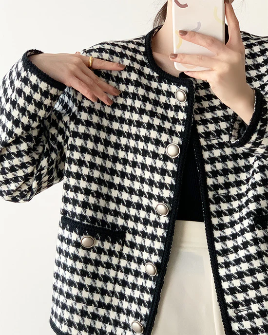 Women Houndstooth Tweed Boucle Blazer Jacket