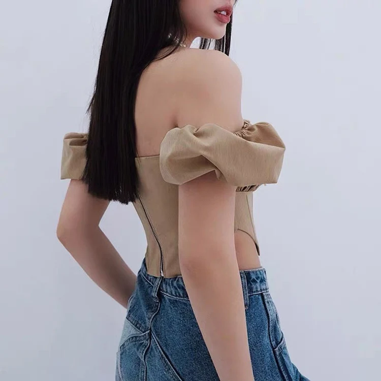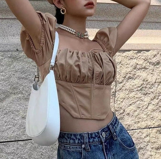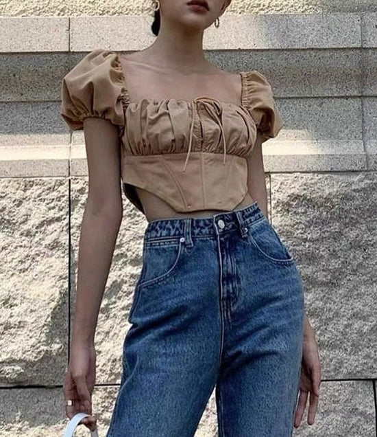 Alyvre Women Puff Short Sleeves Crop Top (Brown)